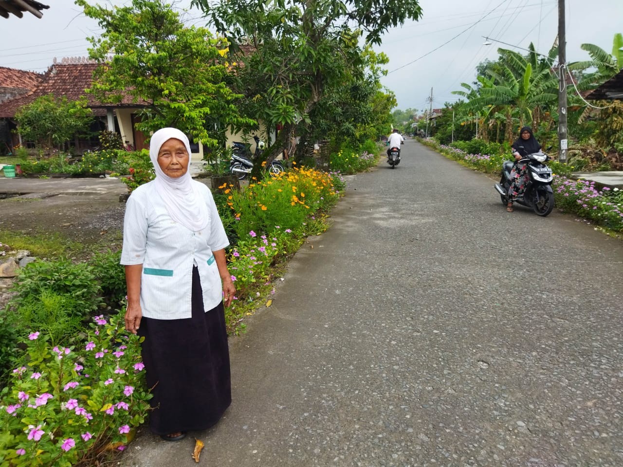 Beliau dengan ikhlas mencabuti rumput dan tanaman-tanaman liar yang mengganggu pemandangan jalan desa dan juga menanam bunga-bunga yang indah di lingkungannya.