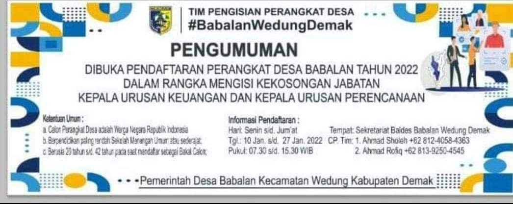 Demak – Pemerintah Desa Babalan Kecamatan Wedung membuka pendaftaran perangkat Desa Babalan tahun 2022. Melalui tim pengisian perangkat desa setempat memberikan kesempatan kepada masyarakat untuk mengisi kekosongan jabatan Kepala Urusan Keuangan dan Kepala Urusan Perencanaan. Untuk pendaftaran dapat dilakukan setiap hari kerja, mulai tanggal 10 Januari sampai 27 Januari 2022, dari pukul 07.00 WIB sampai dengan 15.00 WIB bertempat di Sekretariat Balaidesa Babalan Kecamatan Wedung Kabupaten Demak.