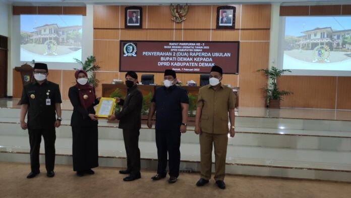 Demak – Dua Raperda Usulan Bupati Demak diserahkan secara langsung Bupati Eisti’anah kepada Ketua DPRD Kabupaten Demak Fahrudin Bisri Slamet (FBS) dalam rapat paripurna ke-2 masa sidang 1 tahun 2022, Senin (07/02/22) di Ruang Rapat Paripurna DPRD Kabupaten Demak. Kedua Raperda tersebut yaitu raperda tentang bangunan gedung dan raperda tentang perubahan kedua atas Peraturan Daerah Kabupaten Demak No 5 Tahun 2015 tentang Kepala Desa.