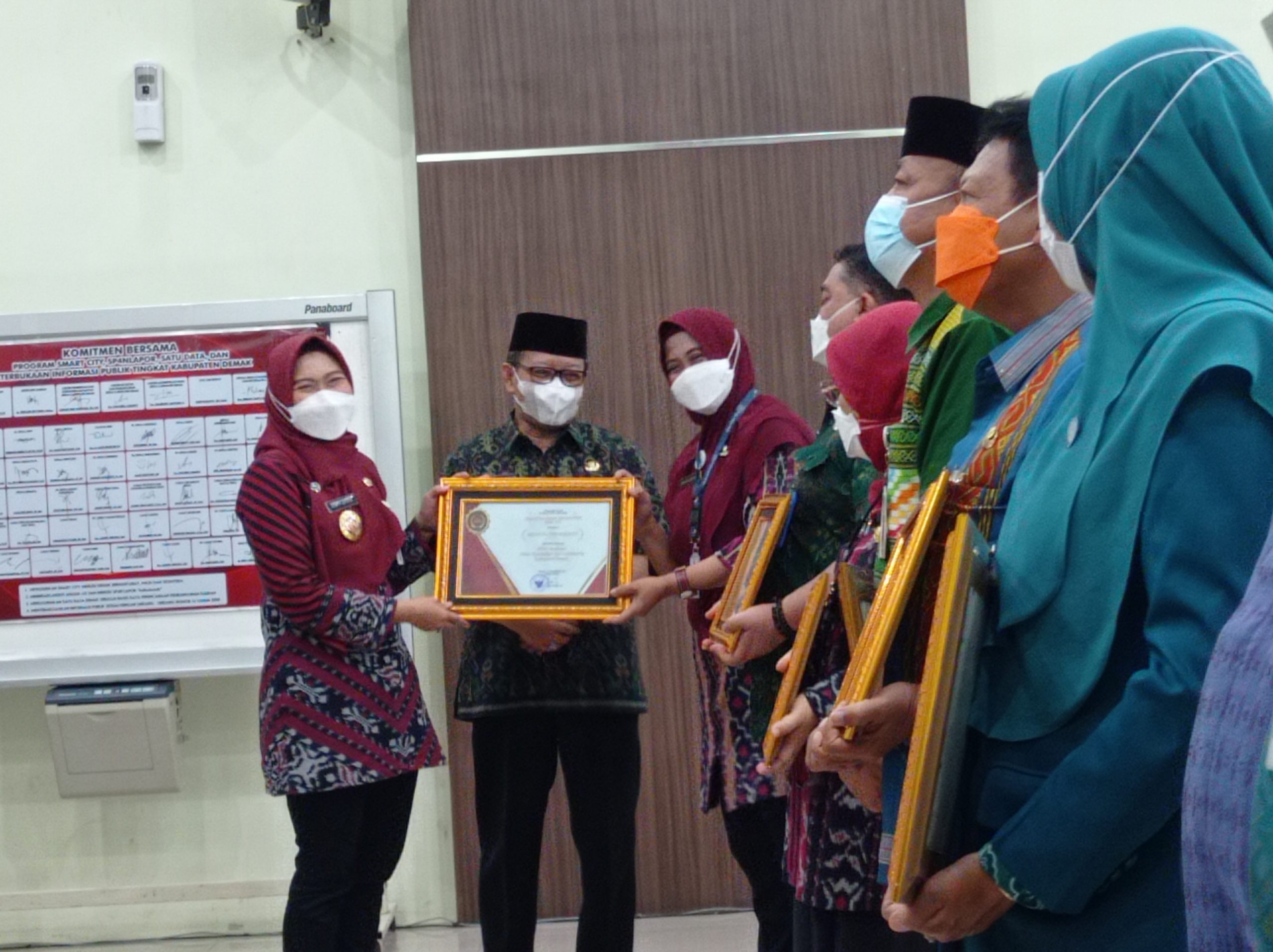 Bupati Demak Eisti’anah menyerahkan penghargaan kepada delapan PPID Pembantu di jajaran perangkat daerah. Penyerahan dilakukan di gedung Grhadika Bina Praja, Selasa ( 8/3/22).