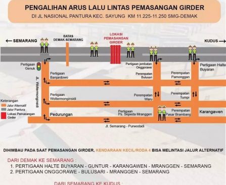 Demak- Sehubungan dengan pemasangan Girder pada proyek jalan tol Semarang – Demak di Km 11.225.11.250, akan dilakukan sistem buka tutup. Pihak Dinas perhubungan dan Satlantas polres demak juga mengarahkan lalulintas dengan pengalihan arus melalui jalur alternatif. Untuk pemasangan girder akan dilakukan selama empat hari, tanggal 11 sampai dengan 14 Maret 2022 mulai pukul 23.00 wib […]