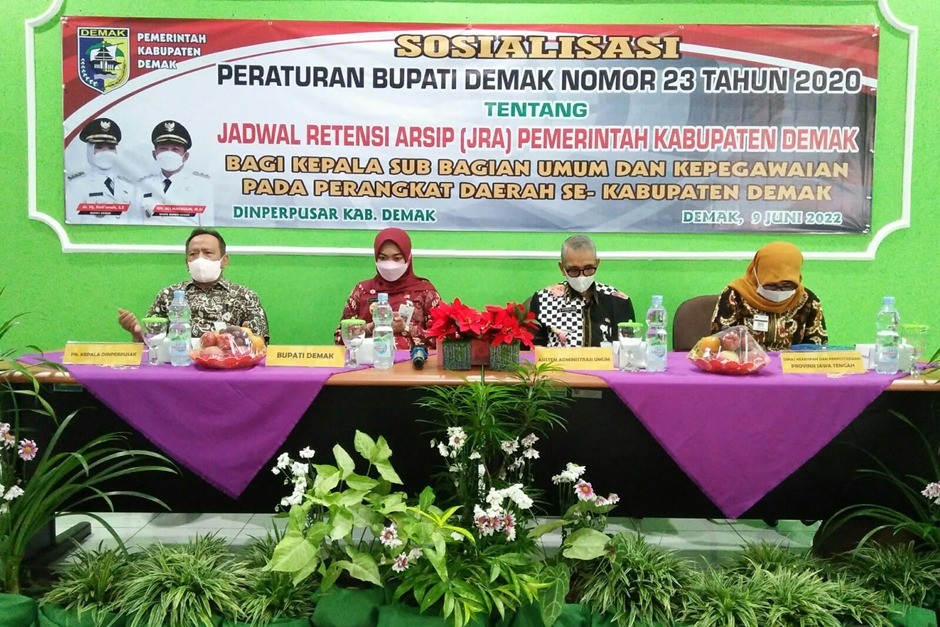 Demak – Dinperpusar Kabupaten Demak sosialisasikan Perbup Demak Nomor 23 Tahun 2020 tentang jadwal retensi arsip Pemerintah Kabupaten Demak yang berlangsung di Aula Dinas setempat, yang di buka langsung oleh Bupati Demak Eisti’anah yang diikuti oleh seluruh Kepala Sub Bagian Umum dan Kepegawaian pada Perangkat Daerah Se-Demak, Kamis (09/06/22).