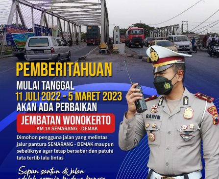 Demak – Sehubungan dengan perbaikan jembatan Wonokerto tepatnya pada KM 18 Karangtengah – Demak akan di mulai pada tanggal 11 Juli 2022 sampai dengan 5 Maret 2023. Maka pengguna Lalu lintas dari Demak ke Semarang maupun sebaliknya diminta untuk melalui jalur alternatif untuk menghindari titik kemacetan selama perbaikan tersebut. Adapun pembangunan jembatan tersebut ada di […]