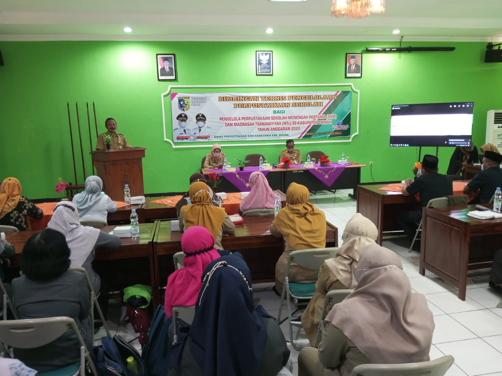 Demak – Dinas Perpustakaan dan Kearsipan (Dinperpusar) Kabupaten Demak mengadakan kegiatan bimtek bagi pengelola perpustakaan sekolah tingkat SMP / MTS tahun 2022 di Ruang Pertemuan Dinperpusar, Senin, (25/7/22).