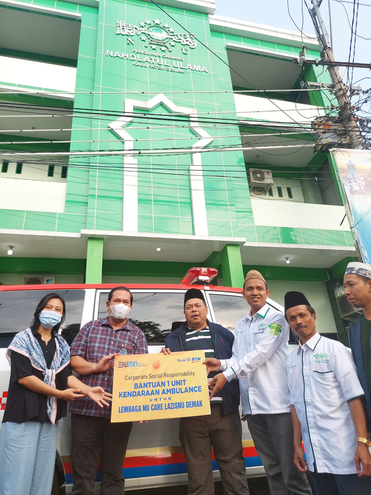 Mobil ambulans diserahkan langsung oleh Sub Branch Head KCP Bank BTN Demak, Oliviani Lajuna Aulia kepada Muadhom dan Arifin selaku perwakilan pengurus Lazisnu Demak. Penyerahan disaksikan Wakil Ketua Komisi XI DPR RI Fathan Subchi dan Deputi Service Manager BTN Kudus, Sanggam.