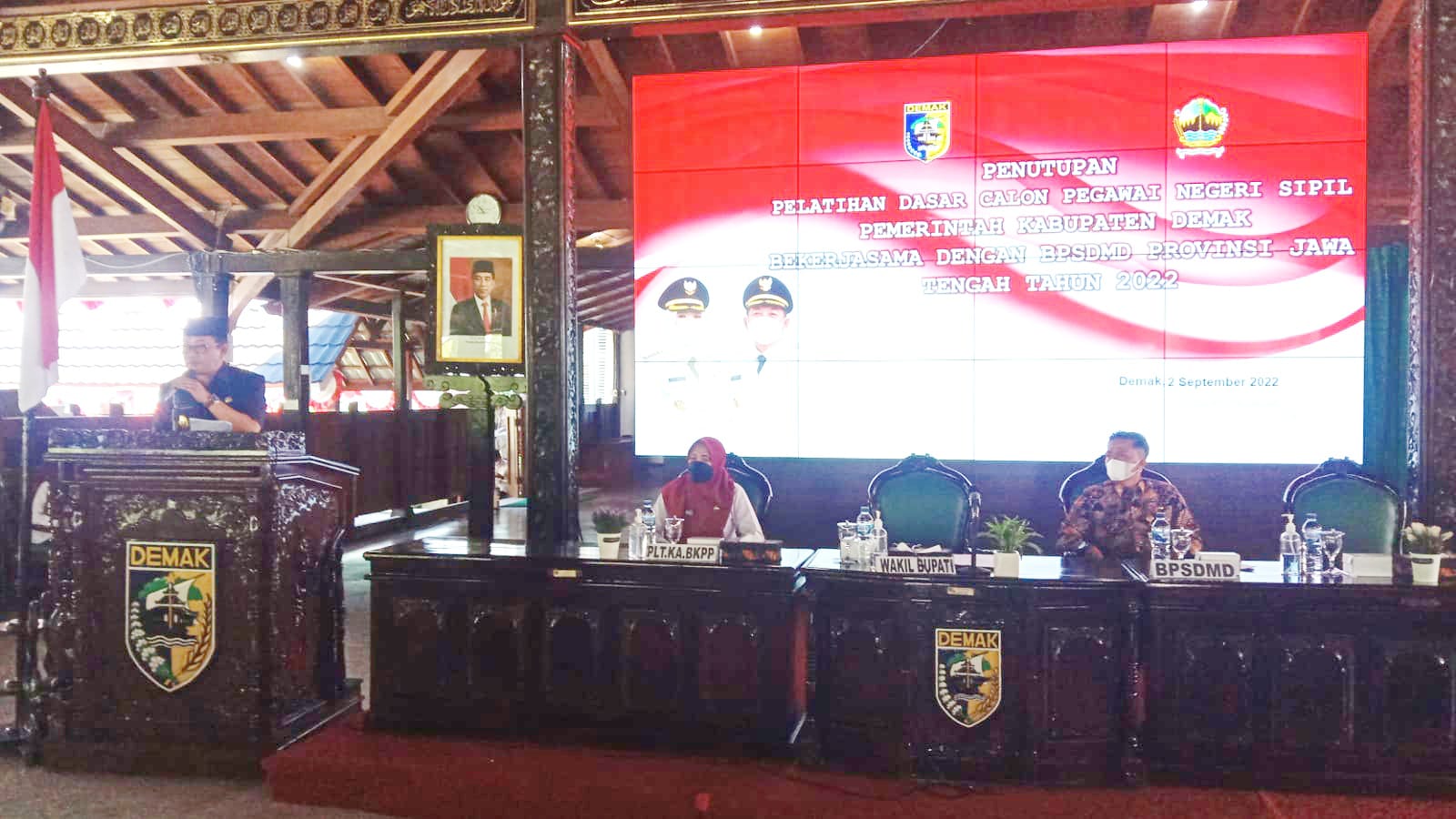 Demak – Wakil Bupati Demak Ali Makhsun secara resmi menutup Diklat Pelatihan Dasar (Latsar) CPNS Tahun 2022 secara luring, Jumat (02/09/22) di Pendopo Satya Bhakti Praja.