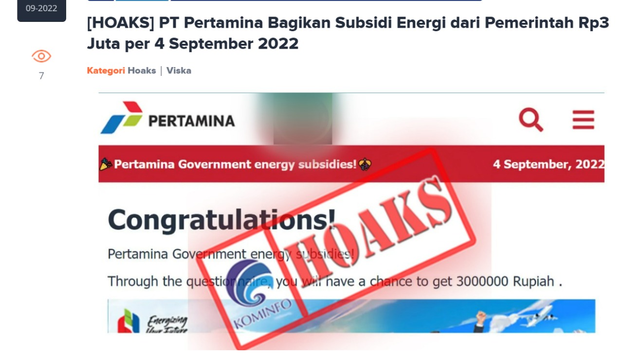 Seiring kenaikan harga bbm tersebut muncul informasi hoax yang menyesatkan dan membuat resah publik beredar di masyarakat , dengan menginformasikan bahwa PT Pertamina bagikan subsidi energi dari pemerintah Rp 3 juta per 4 September 2022.