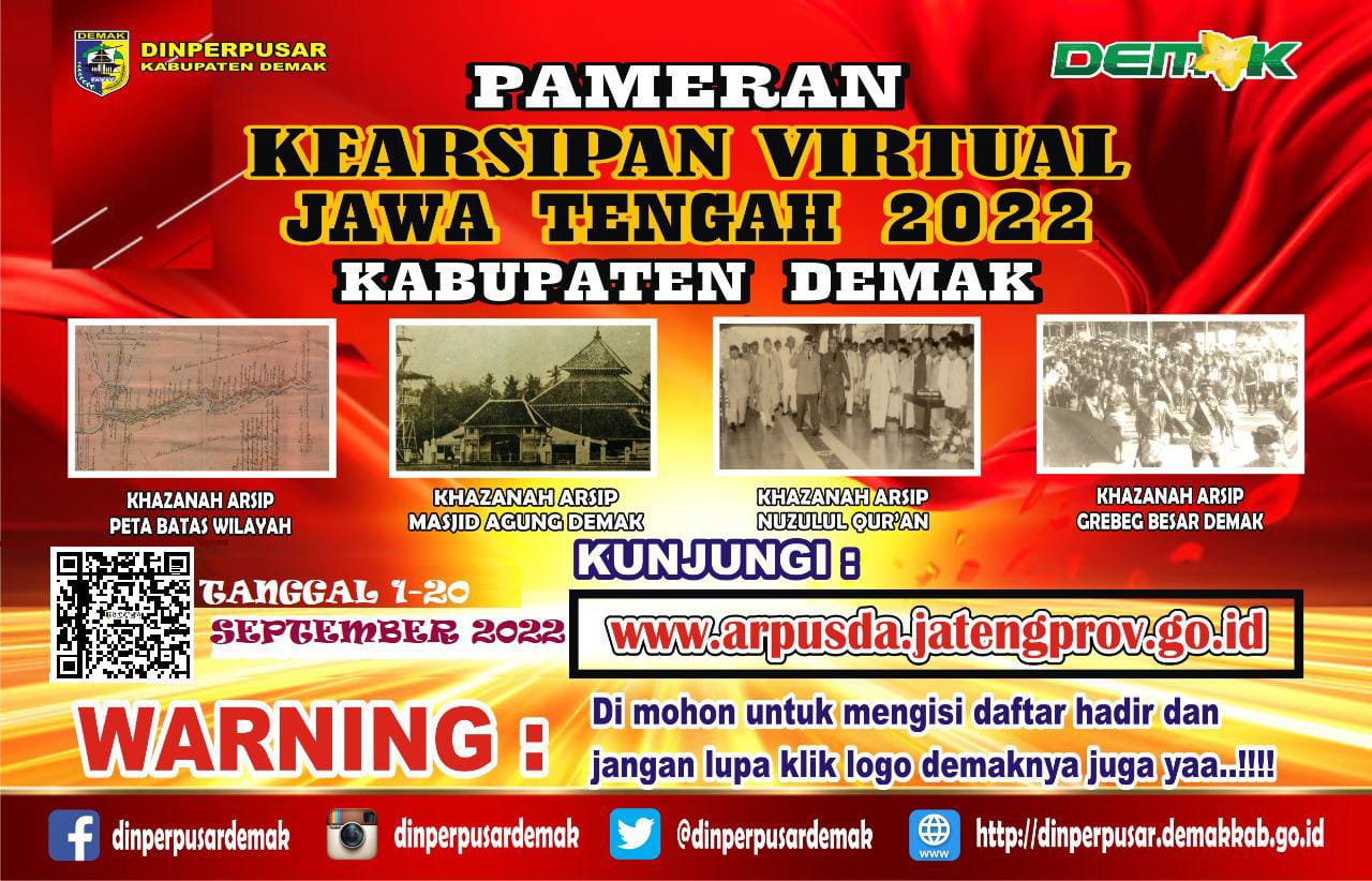 Demak – Dinas Kearsipan dan Perpustakaan (Arpus) Provinsi Jawa Tengah bekerja sama dengan Arsip Nasional Republik Indonesia (ANRI) dan Pemerintah Kabupaten/Kota se-Jawa Tengah menyelenggarakan pameran kearsipan virtual mulai 1 sampai 20 September 2022. Dinas Perpustakaan dan Kearsipan (Dinperpusar) Kabupaten Demak turut ikut berpartisipasi dalam ajang pameran tersebut.