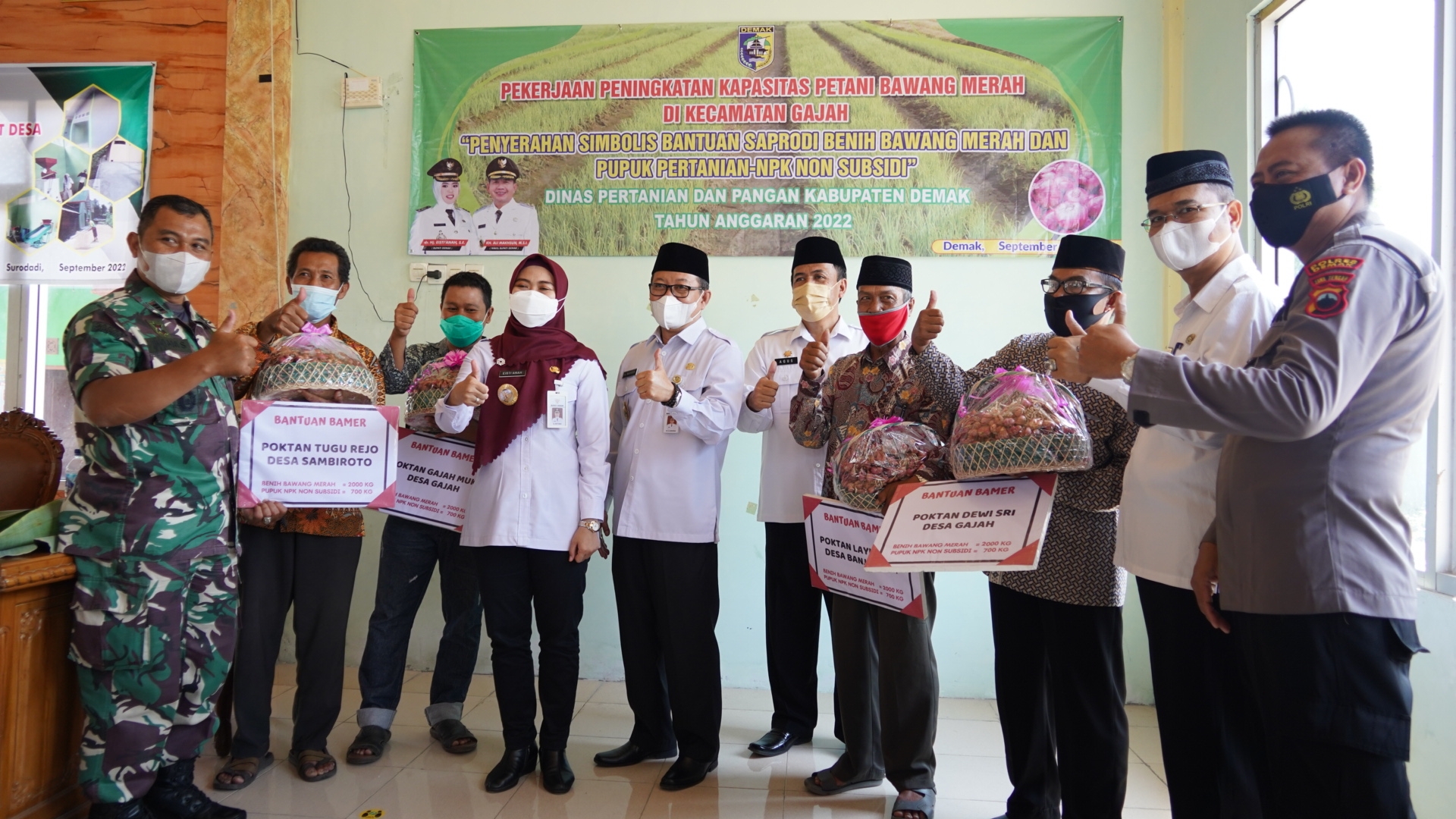 Dalam kegiatan tersebut Bupati Demak Eisti”anah menyampaikan bahwa tidak hanya memberikan bantuan itu saja namun juga memberikan bantuan berupa benih bawang merah sebanyak 2000 Kg dan pupuk NPK ( Nitrogen, Phosphat dan Kalium) Non Subsidi 700 Kg kepada 4 Poktan