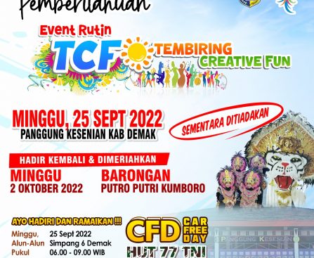 Demak – Event Rutin TCF (Tembiring Creative Fun) pada Minggu ini tanggal 25 September 2022 sementara di liburkan. Hal tersebut di ungkapkan oleh Plt Kepala Dinas Pariwisata Kabupaten Demak Endah Cahya Rini, Kamis, (22/9/22) di sela – sela pekerjaannya. “Minggu ini kegiatan TCF di tindakan dulu karena kita menyambut HUT TNI yang ke 77 tahun. […]