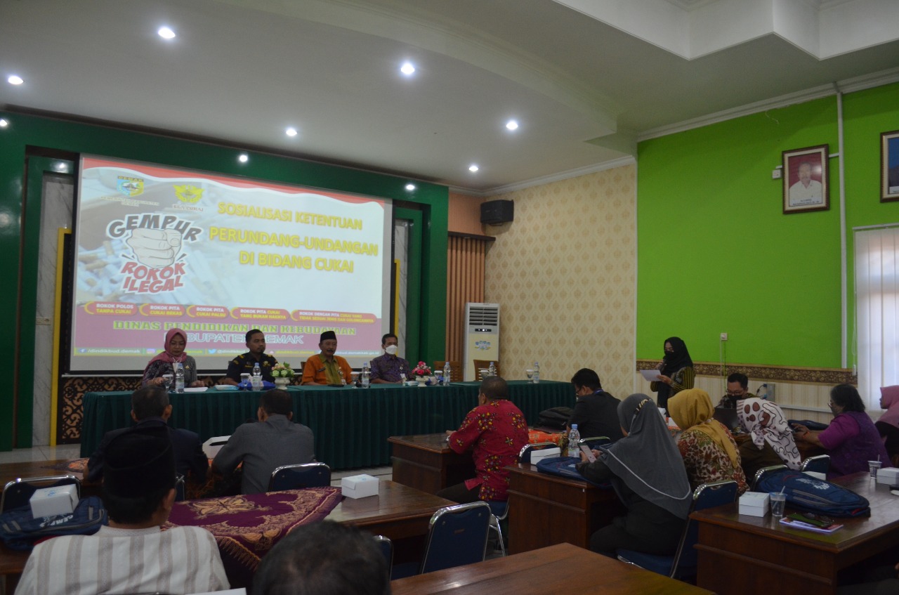 Demak – Dinas Pendidikan dan Kebudayaan (Dindikbud) Kabupaten Demak menggelar Sosialisasi Ketentuan Peraturan Perundang-Undangan di Bidang Cukai ‘Gempur Rokok Ilegal’. Acara yang dilaksanakan di Aula Dindikbud, Selasa (27/09/22) di buka oleh Pj Sekda Eko Pringgolaksito dan menghadirkan narasumber dari Bagian Perekonomian dan SDA Kabupaten Demak serta Bea Cukai Semarang.