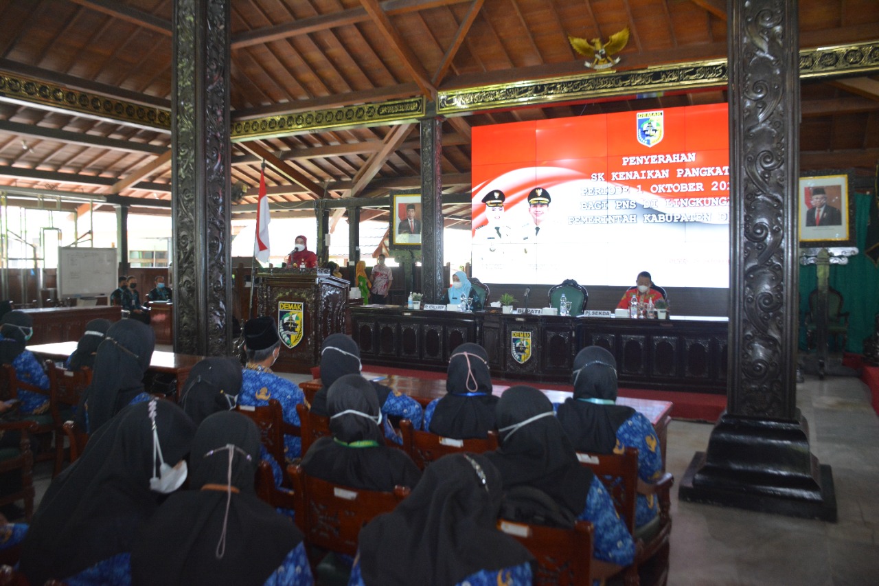 Demak – Sebanyak 624 PNS di lingkungan Pemerintah Kabupaten Demak menerima Surat Keputusan (SK) kenaikan pangkat periode 1 Oktober 2022. Penyerahan dilakukan oleh Bupati Demak Eisti’anah di Pendopo Satya Bhakti Praja, Rabu (26/10/22).