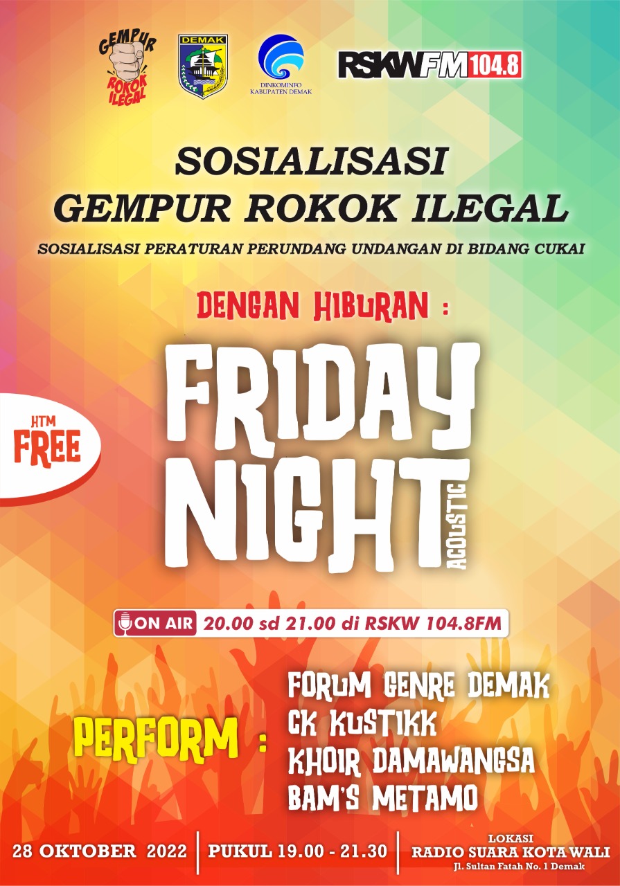 “Malam ini akan ada penampilan dari CK Kustik, Khoir Damawangsa, Bam’s Metamo dan Forum Genre Demak. Tentunya dipandu oleh host terasik dari penyiar Radio Suara Kota Wali (RSKW), dijamin seru!,”kata Endah.