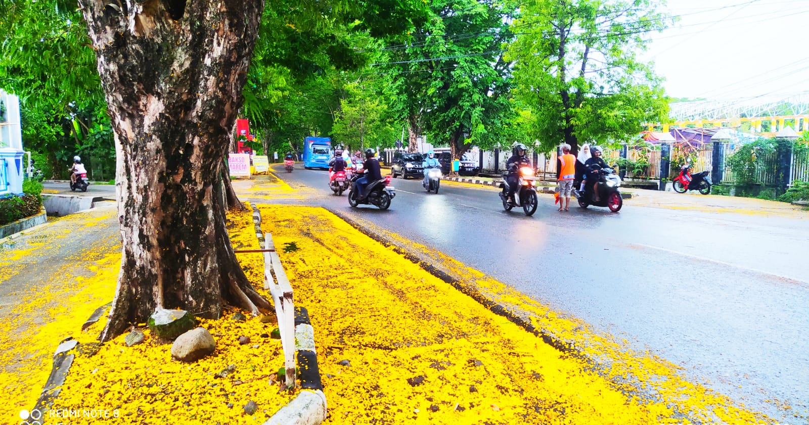 Pohon akasia yang berdiri di sisi kanan kiri jalan terutama di sekitar stadion dan dinas kominfo Demak telah mekar bunganya berwarna kuning dan berguguran. Sehingga mengubah pemandangan lingkungan tersebut menjadi lain dari biasanya.