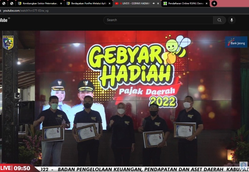 Demak – Pemerintah Kabupaten Demak menggelar Gebyar Hadiah Pajak Daerah Tahun 2022. Dalam gebyar tersebut akan diumumkan doorprize sebagai penyemangat kepada Desa, Kecamatan, Perorangan maupun Perusahaan dengan Kategori Kecamatan Lunas PBB-P2 Tercepat, Kecamatan Kontribusi Terbesar Dengan Capaian diatas 80 persen PBB-P2, Kategori Desa Lunas PBB P2 Tercepat, Kategori Wajib Pajak Kontribusi Terbesar, Kategori Pajak PBHTB, dan Kategori Wajib Pajak PBB-P2 Perusahaan.