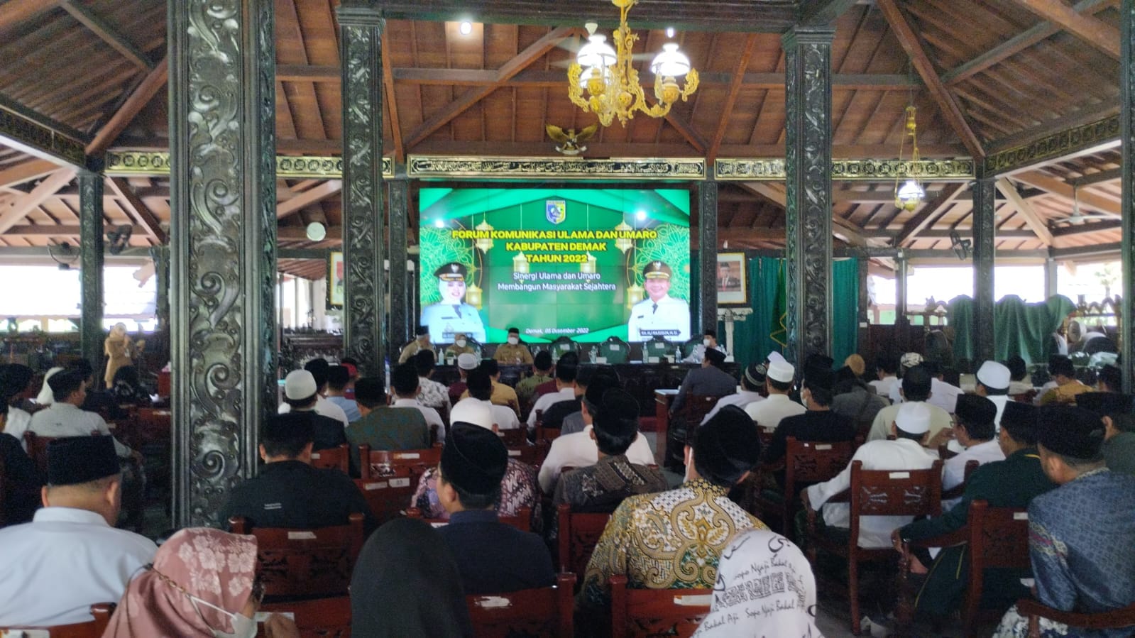 Demak – Pemkab Demak gelar Forum Komunikasi Ulama dan Umaro Kabupaten Demak Tahun 2022 dengan tema Sinergi Ulama dan Umaro Membangun Masyarakat Sejahtera, di Pendopo Satya Bhakti Praja, Senin (5/12/2022).