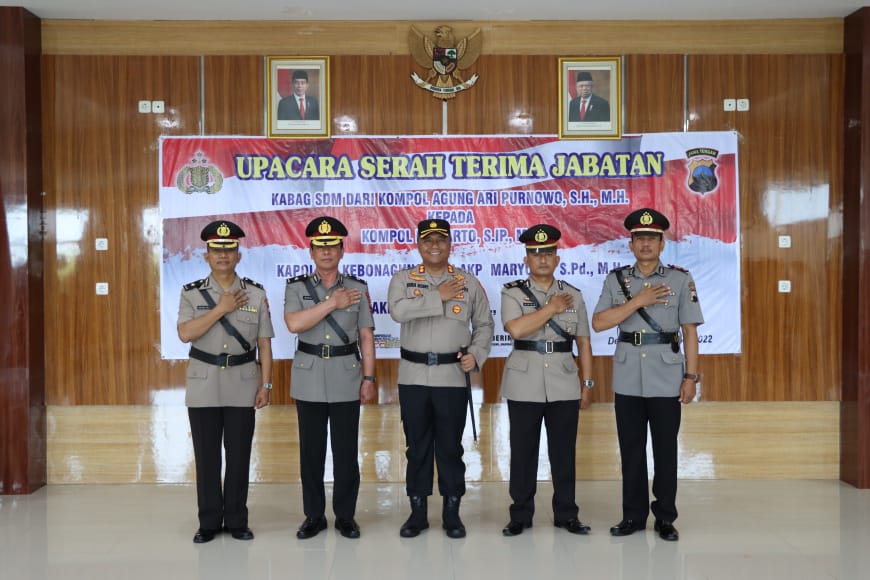 Demak – Upacara serah terima jabatan Kabag Sumber Daya Manusia (SDM) dari Kompol Agung Ari Purnowo kepada Kompol Budiarto, dan Polsek Kebonagung dari AKP Maryoto kepada AKP Rismanto di pimpin langsung oleh Kapolres Demak AKBP Budi Adhy Buono, di Aula Polres Demak, Selasa (13/12/22).