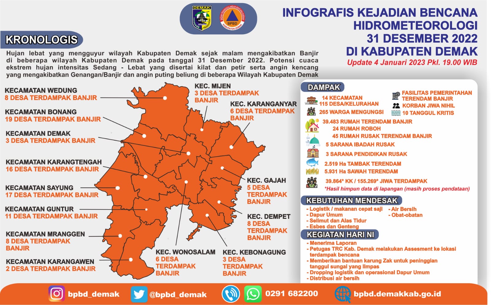 Demak – Plt Kepala Pelaksana BPBD Kabupaten Demak M. Agus Nugroho Luhur P dalam laporan tertulisnya terkait laporan PUSDALOPS PB BPBD  Update Data Bencana hidrometeorologi pada, Rabu (04/01/23) malam menyebutkan,  terjadi bencana banjir pada tanggal 31 Desember 2022 akibat hujan lebat yang mengguyur wilayah Demak dari tanggal 30 Desember 2022.
