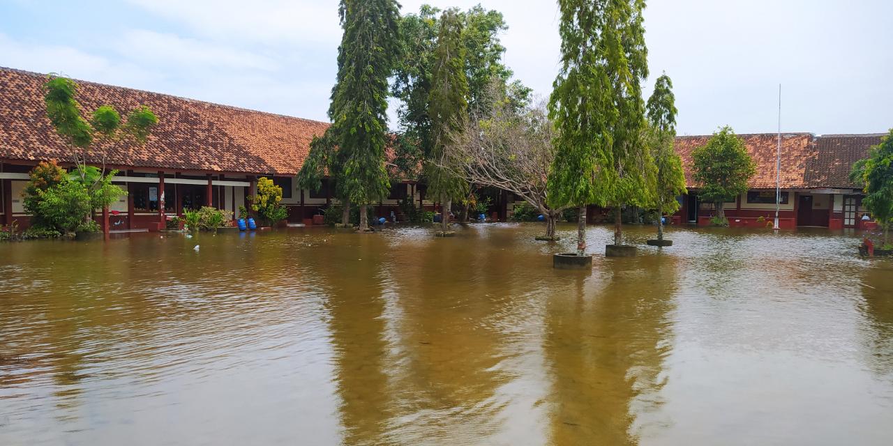 Demak- Banjir di Desa Prampelan Kecamatan Sayung tidak hanya menggenangi pemukiman dan area persawahan. Namun juga masih menggenangi di lembaga pendidikan. Dampaknya para siswa Taman kanak-kanak dan Sekolah dasar tidak bisa belajar secara tatap muka, air masih menggenangi lingkungan sekolah sedalam 20-30 cm,Kamis (5/1/23).