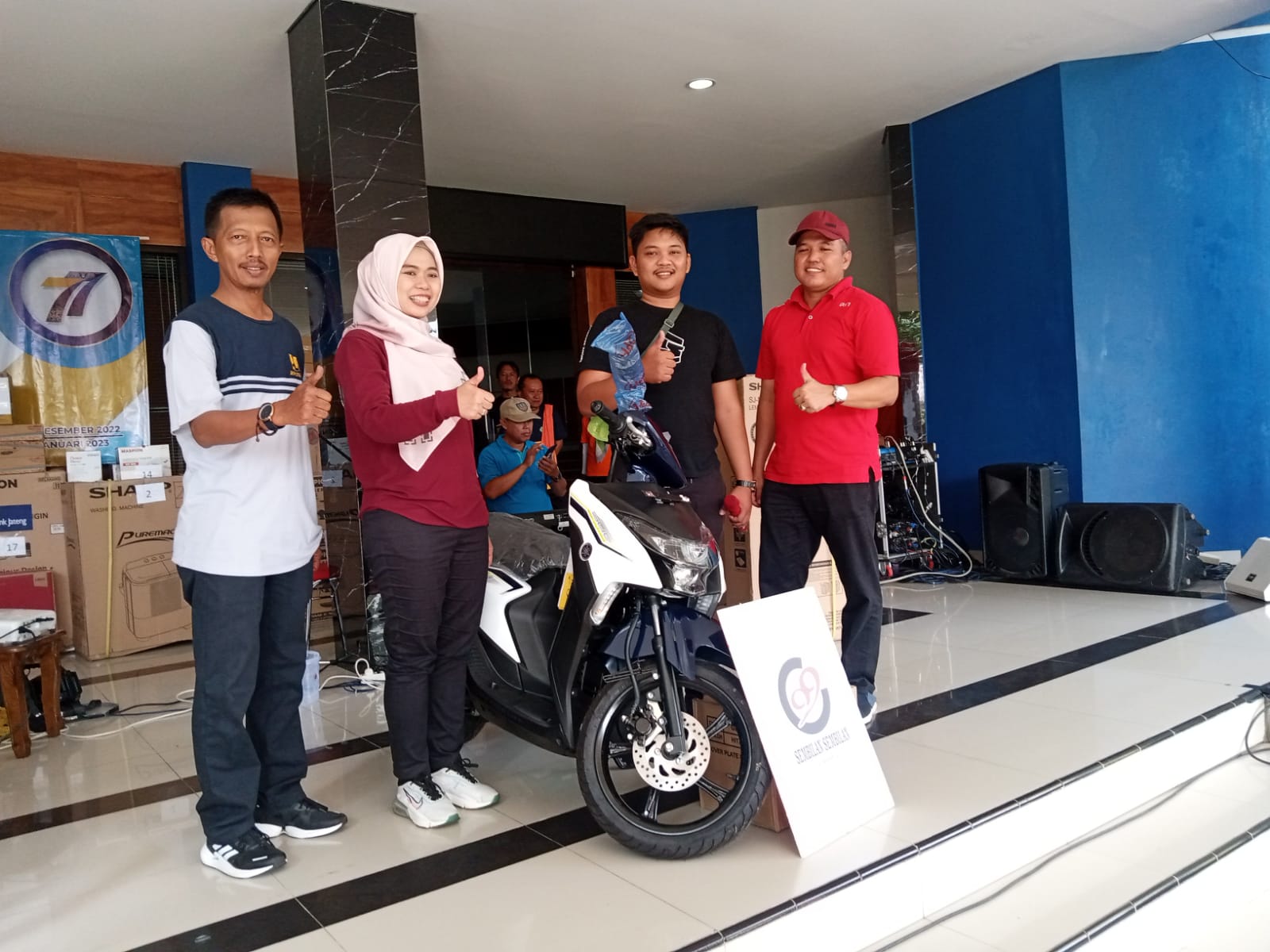 Demak – Keberuntungan menjadi milik Riza Adi Pratama Tenaga Fasilitator Lapangan (TFL) Sanitasi Cipta Karya Dinas Pekerjaan Umum dan Tata Ruang (Dinputaru) Kabupaten Demak, yang telah mendapatkan Doorprize satu unit sepeda motor Yamaha Gear.