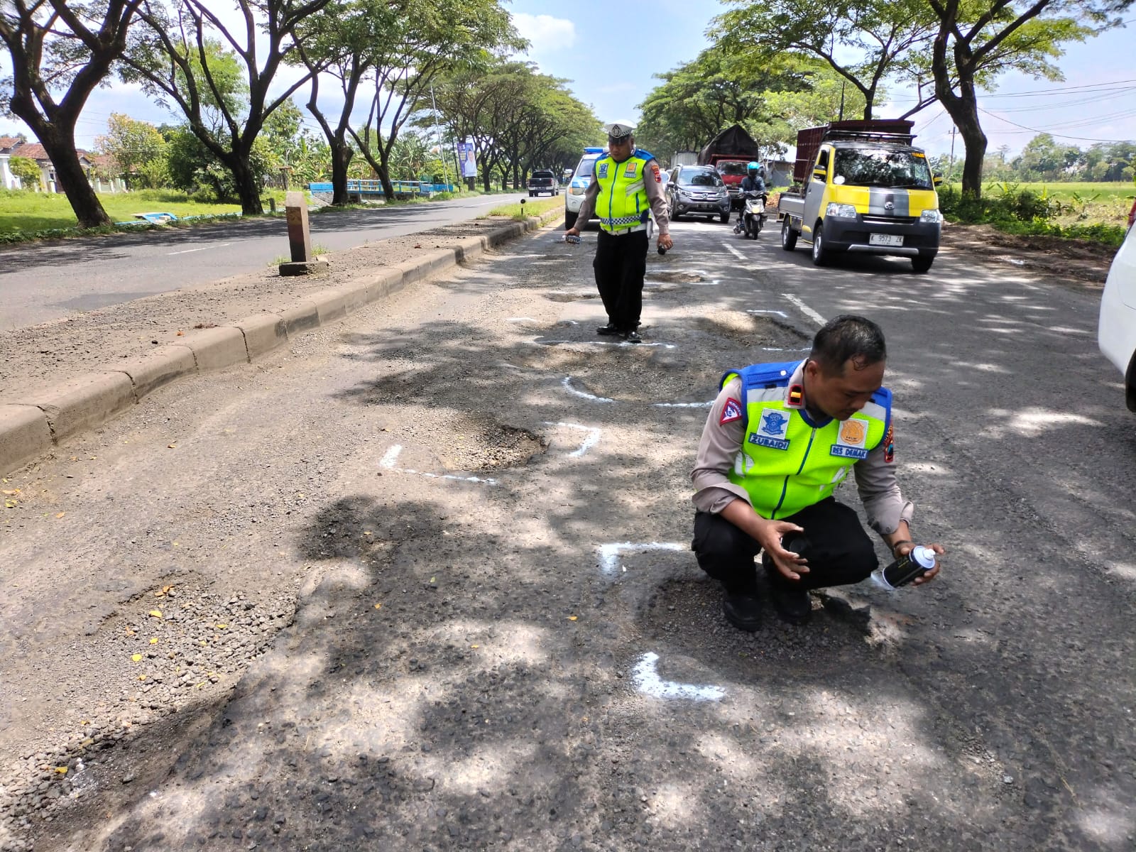 Di sisi lain pada titik Pantura Jalan Kalikondang, Kecamatan Demak, juga terlihat lubang jalan telah ditandai dengan lingkaran berwarna putih.