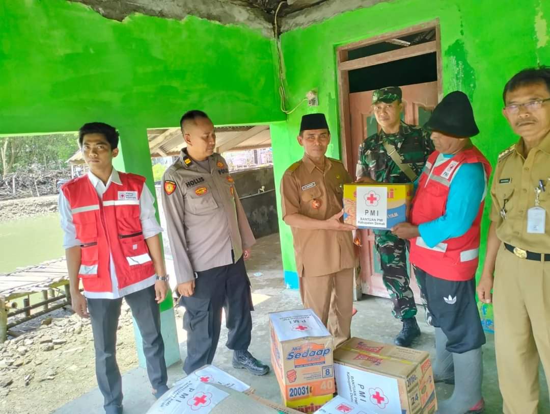 DEMAK – PMI cabang Demak serahkan bantuan kebutuhan dasar bagi warga Desa Timbul Sloko yang terdampak rob. Bantuan diserahkan kan perwakilan PMI Zuliadi kepada kepala desa Timbulsloko Nadhiri.
