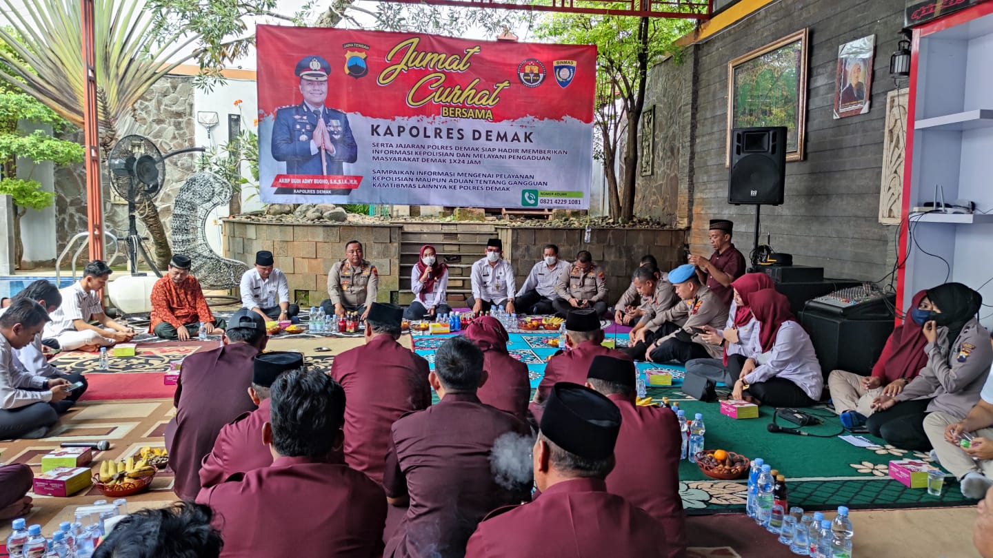 Sementara Kapolres Demak AKBP Budi Adhy Buono dalam kesempatan tersebut menyampaikan, ini merupakan hari yang spesial karena kita dapat hadir di kegiatan Jum’at Curhat ini bersama Bupati Demak.