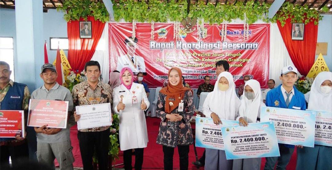 Dalam kesempatan tersebut, Ganjar juga menyerahkan sejumlah bantuan kepada warga yang masuk dalam kategori miskin ekstrem dan desa dengan kategori miskin di Grobogan dan Demak. Di antaranya pemasangan listrik murah bagi masyarakat tidak mampu sebanyak 253 KK di Grobogan sebesar Rp 227,7 juta serta beasiswa untuk empat siswa SMA di Kabupaten Grobogan dan Demak masing-masing sebesar Rp 2,4 juta.