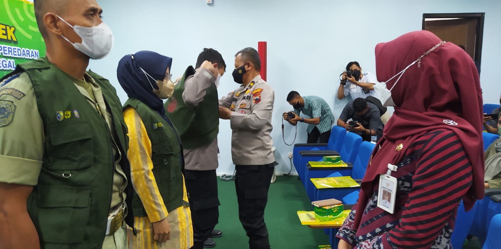 Pada kesempatan tersebut bupati bersama kasatpol PP dan perwakilan Polres secara bergantian memakaikan rompi gempur rokok ilegal kepada perwakilan peserta.