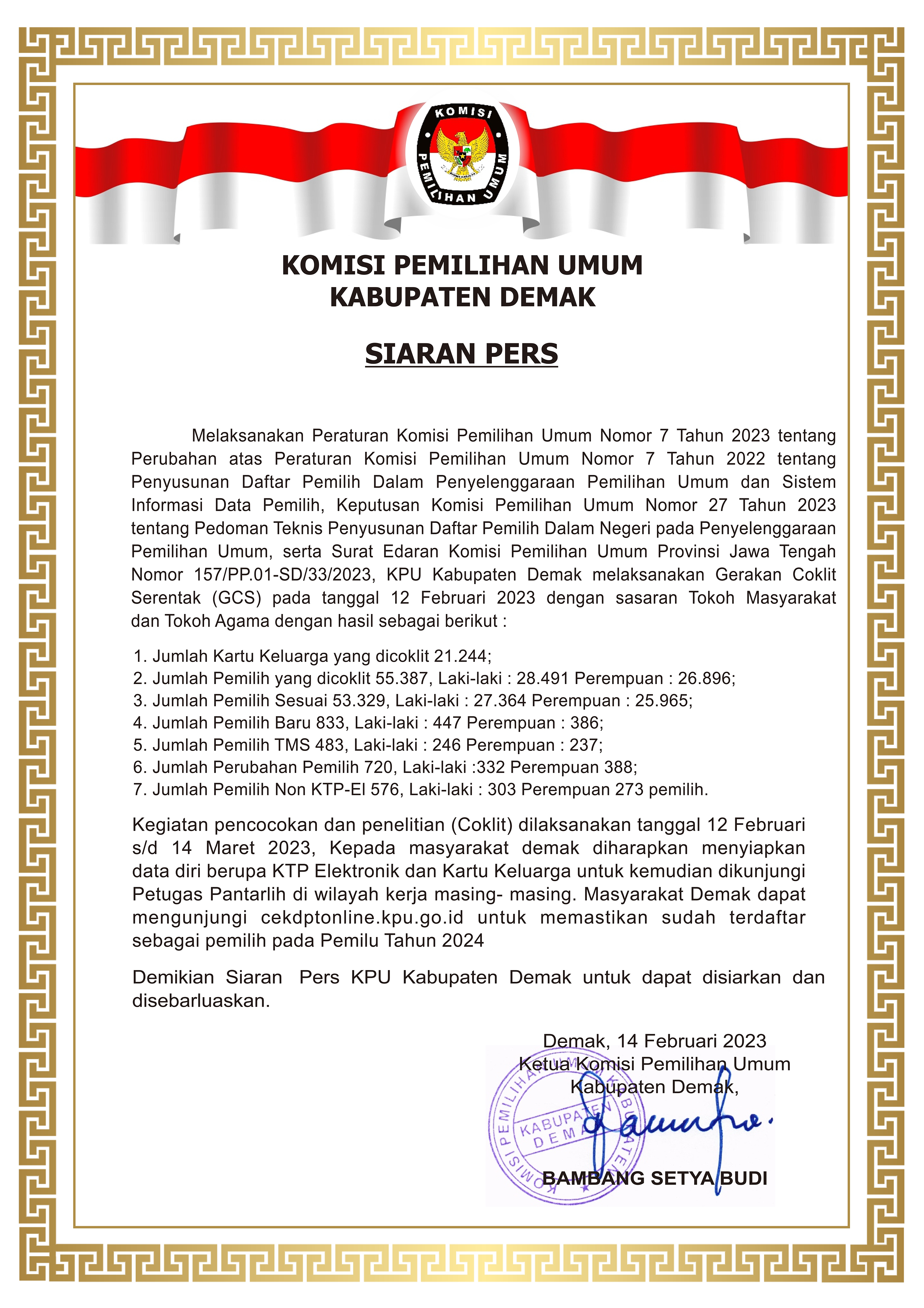“Kegiatan pencocokan dan penelitian (Coklit) dilaksanakan tanggal 12 Februari sampai dengan 14 Maret 2023, kepada masyarakat demak diharapkan menyiapkan data diri berupa KTP Elektronik dan Kartu Keluarga untuk kemudian dikunjungi,” Kata Bambang