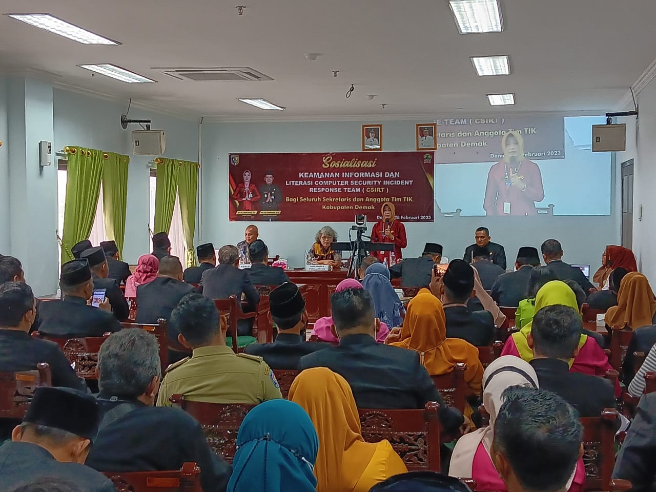 Demak – Dinas Komunikasi dan Informatika Kabupaten Demak bekerjasama dengan Dinas Komunikasi dan Informatika Provinsi Jawa Tengah, menyelenggarakan Sosialisasi keamanan informasi dan literasi Computer Security Incident Response Team (CSIRT) bagi seluruh sekretaris dan anggota tim TIK Kabupaten Demak, bertempat di Ballroom Wakil Bupati Lantai 2, Selasa, (28/2/23).