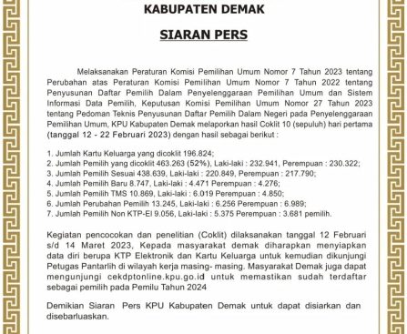 Demak – Keputusan Komisi pemilihan Umum nomor 27 Tahun 2023 tentang pedoman Teknis penyusunan Daftar pemilih Dalam Negeri pada penyelenggaraan pemilihan Umum KPU Kabupaten Demak melaporkan Hasil Coklit 10 ( Sepuluh) hari pertama tanggal 12-22 Februari 2023. Adapun jumlah yang di Coklit sebanyak 196.824, dan jumlah pemilih yang di Coklit ada 463.263 (52%), Laki-laki 232.941, […]