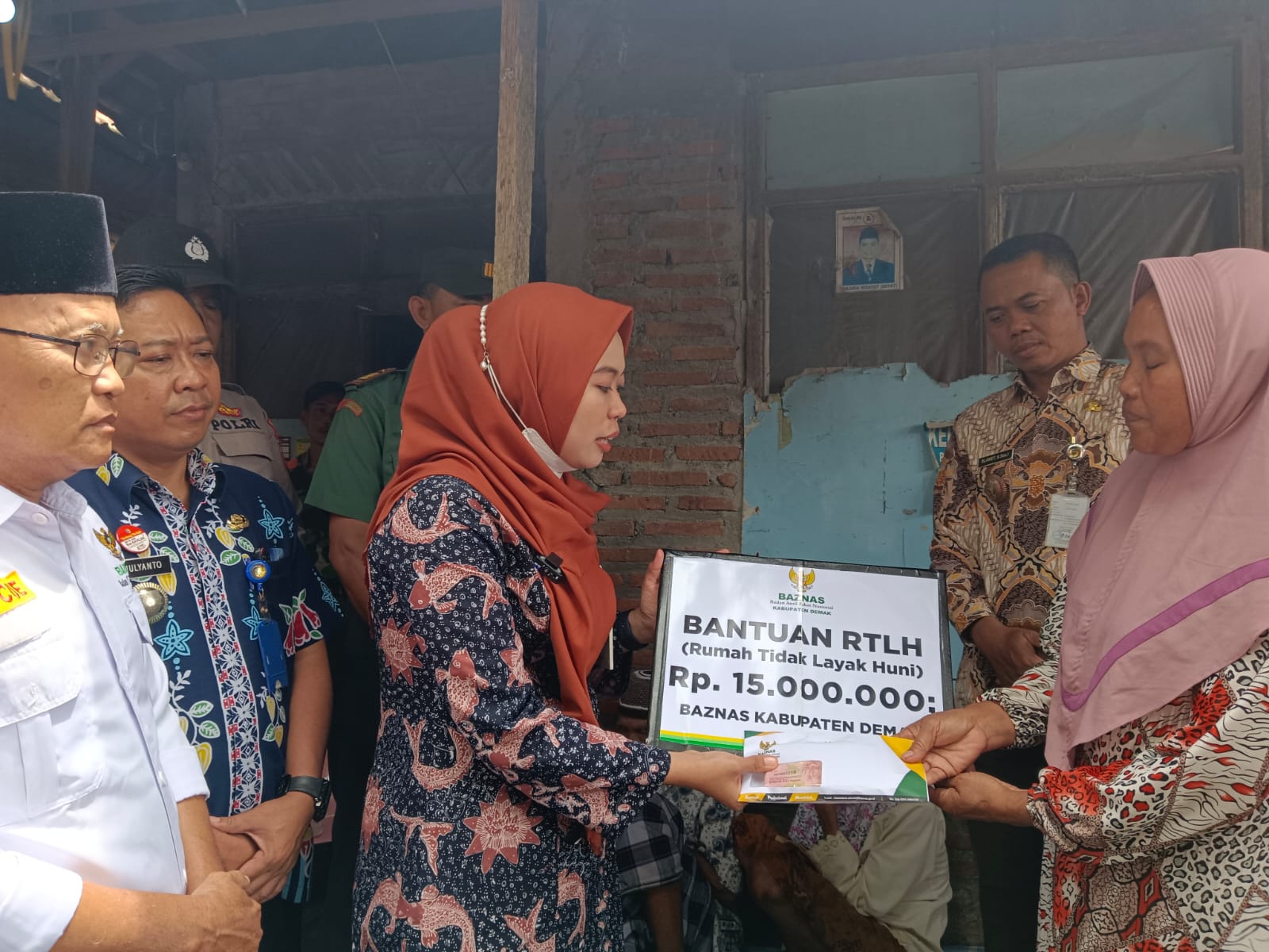 Demak – Bupati Demak Eisti’anah didampingi Ketua Badan Amil Zakat Nasional (Baznas) Kabupaten Demak Bambang Soesetiarto, menyerahkan bantuan secara simbolis bantuan Rumah Tidak Layak Huni (RTLH) senilai Rp. 15.000.000 dan Bantuan Biaya Hidup Rp. 400.000 kepada warga Desa Bungo RT.02 RW.06 Kecamatan Wedung, Kabupaten Demak. Rabu, (1/3/23).
