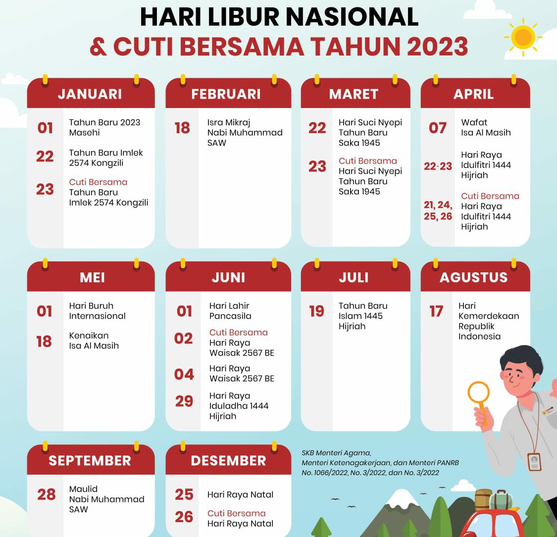 Seperti diketahui dari Surat Keputusan Bersama (SKB) telah di tetapkan hari libur nasional dan cuti bersama tahun 2023 sebanyak 24 hari. Terdiri dari libur nasional sebanyak 16 hari dan cuti bersama sebanyak 8 hari.