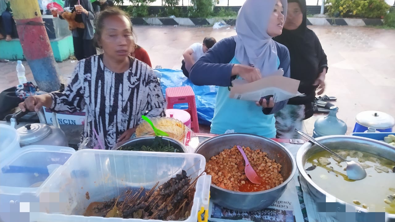 Salah satunya ibu imam bersama dua temanya membuka lapak lontong pecel dan sate keong di lokasi megengan.