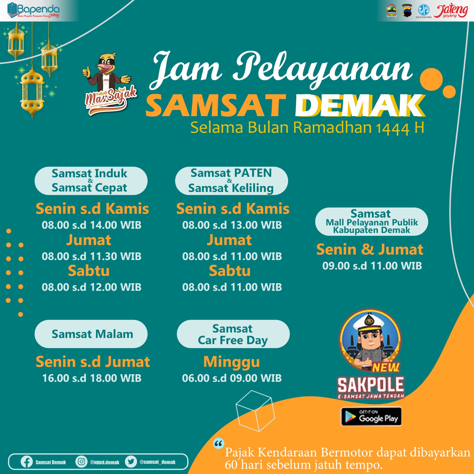 Adapun jadwal operasional samsat dan samsat keliling Kabupaten Demak selama bulan Ramadhan 1444 H tahun 2023 yakni :