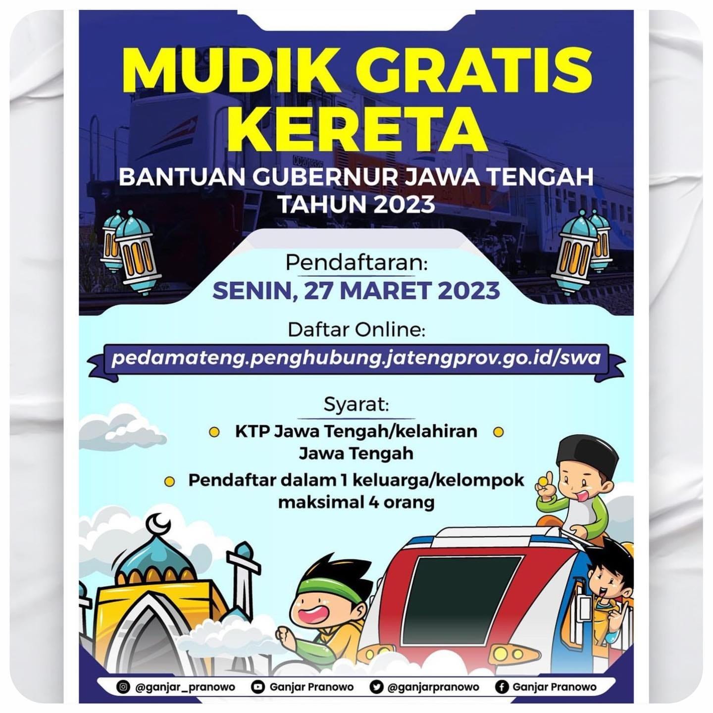 Adapun persyaratan pendaftaran yakni memiliki Kartu Tanda Penduduk (KTP) Jawa Tengah, Kelahiran Jawa Tengah, kemudian pendaftar salam satu keluarga atau kelompok maksimal empat orang.