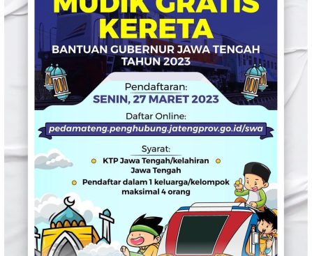 Demak – Gubernur Jawa Tengah memberikan bantuan mudik gratis kereta bagi warga masyarakat wilayah Jawa Tengah. Adapun persyaratan pendaftaran yakni memiliki Kartu Tanda Penduduk (KTP) Jawa Tengah, Kelahiran Jawa Tengah, kemudian pendaftar salam satu keluarga atau kelompok maksimal empat orang. Pendaftaran di buka pada Senin, 27 Maret 2023, dapat melalui pendaftaran online pedamateng.penghubung.jatengprov.go.id/swa Hal tersebut […]