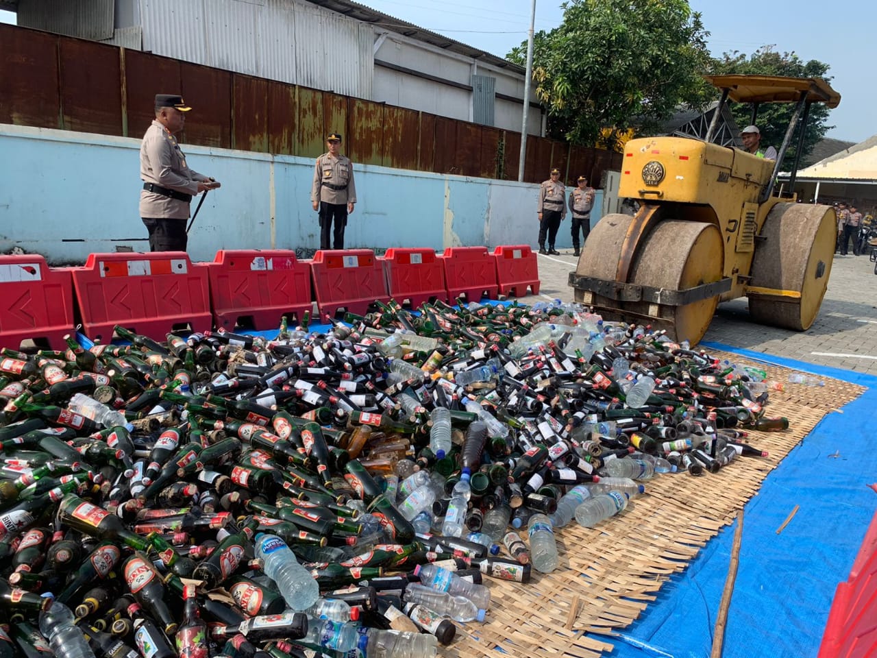 Demak – Sebanyak 5139 minuman keras (miras) berbagai merk hasil sitaan selama operasi yustisi yang di gelar beberapa waktu lalu, dimusnahkan oleh polres Demak dengan digilas menggunakan alat berat tendem roller (mesin penggilas) di halaman Mapolres Demak. Turut menyaksikan pemusnahan Unsur Forkopimda dan pejabat Polres Demak, Senin (17/4/23).
