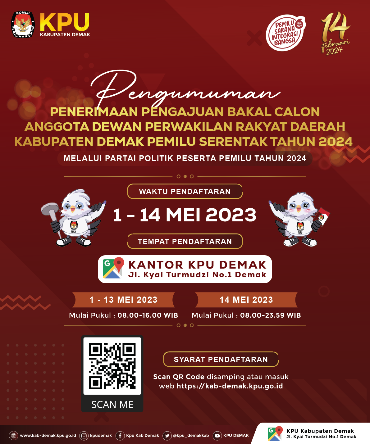 Demak – Komisi Pemilihan Umum (KPU) Kabupaten Demak membuka Penerimaan Pengajuan Bakal Calon Anggota Dewan Perwakilan Rakyat Daerah (DPRD) Kabupaten Demak pada Pemilu Serentak Tahun 2024.