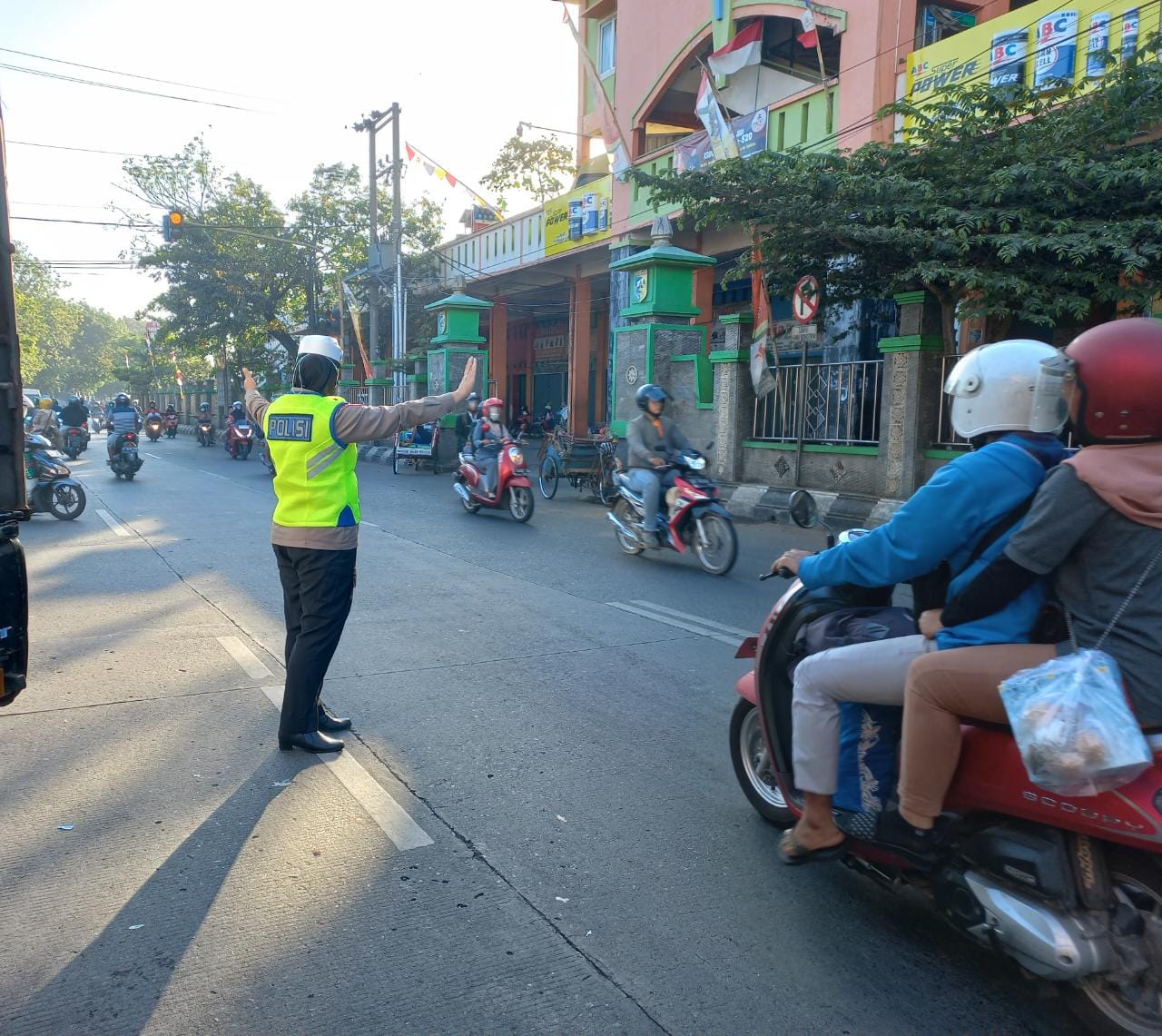 Demak – Satlantas Polres Demak menempatkan personelnya untuk melaksanakan pengaturan arus lalu lintas secara rutin. Kegiatan tersebut di lakukan sebagai antisipasi kemacetan dan laka lantas pada pagi hari.