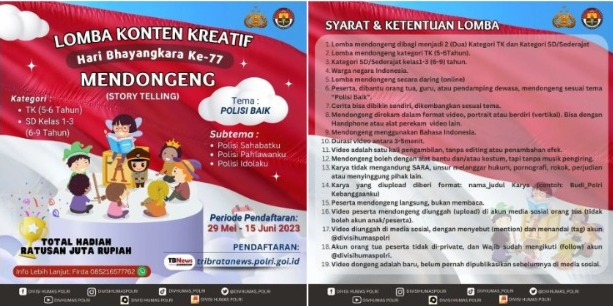 Demak – Dalam rangka menyambut Hari Bhayangkara Ke-77, Kepolisian Negara Republik Indonesia (Polri) menggelar Lomba Konten Kreatif Mendongeng (Story Telling) dengan total hadiah ratusan juta rupiah.