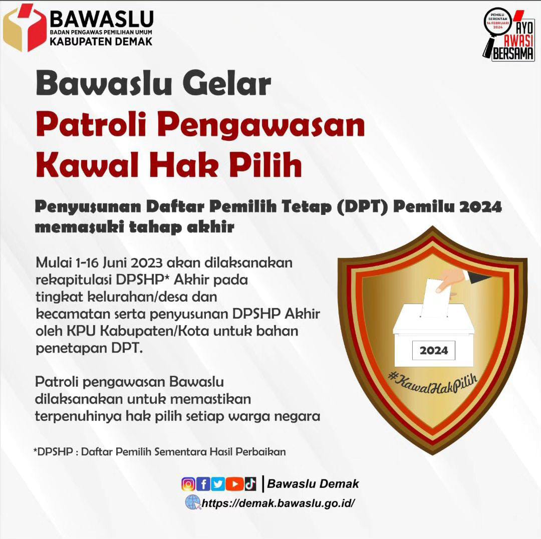 Demak – Badan Pengawas Pemilihan Umum (Bawaslu) Kabupaten Demak menggelar Patroli Pengawasan Hak Pilih untuk memastikan terpenuhinya hak pilih setiap warga Negara pada Pemilu 2024.