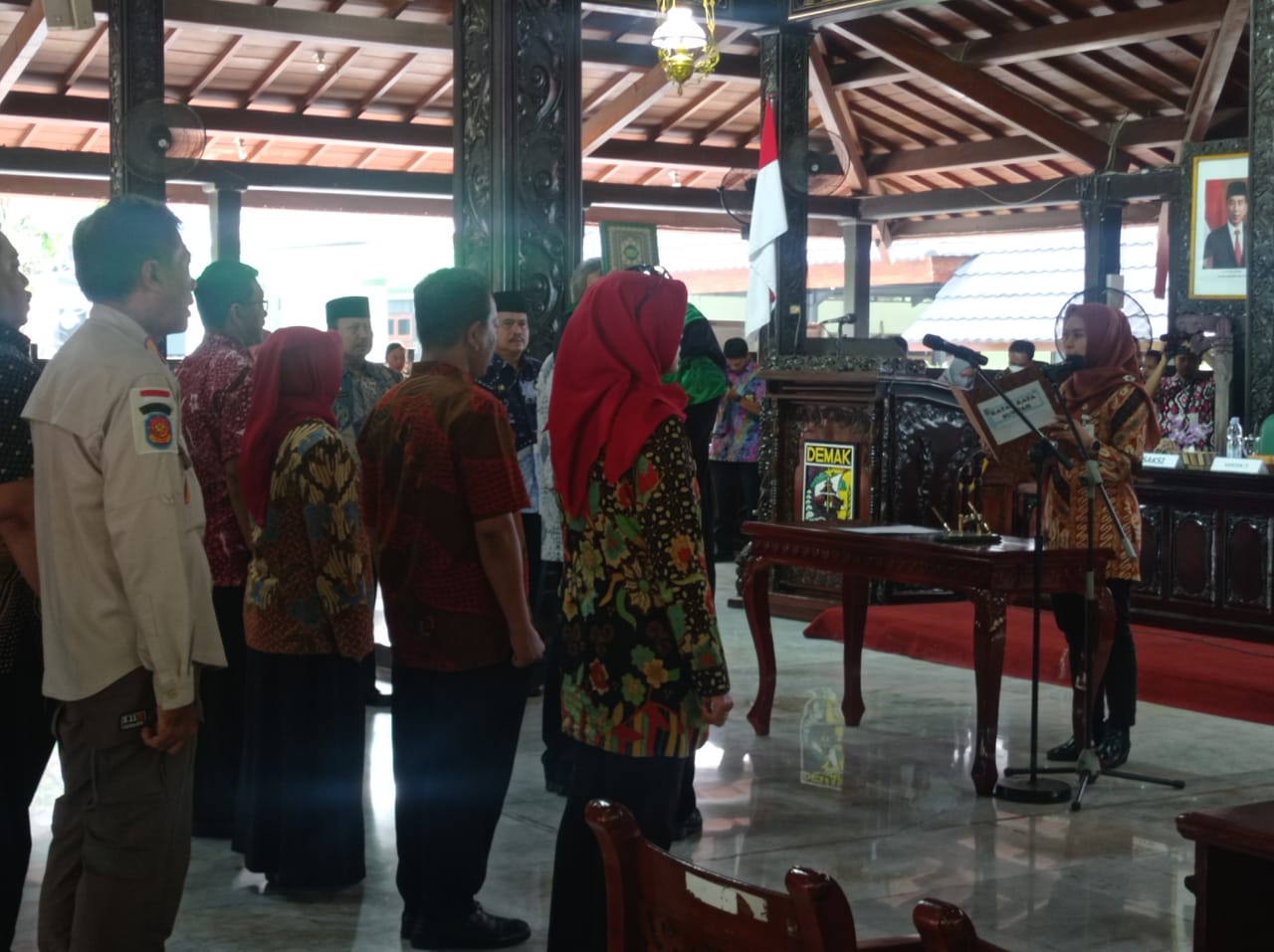 Acara pelantikan dan pengambilan sumpah/ janji dipimpin Bupati Demak Eisti’anah, 20 pejabat tersebut meliputi Pembina Utama Muda (IV/c), Pembina Tingkat I (IV/b), Pembina (IV/a), Penata Tingkat I (III/d), Penata (III/c). Pembina Utama Muda (IV/c), turut dilantik Umar Surya Sukmana Kepala Dinas Penanaman Modal dan Pelayanan Terpadu Satu Pintu (DINPMPTSP) sebagai Penjabat Sekretaris Daerah Kabupaten Demak disamping jabatan definitifnya.