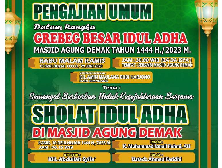 Sehubungan dengan pelaksanaan sholat Idul Adha, Fatchan menambahkan pihak Takmir Masjid Agung Demak akan melaksanakan sholat Idul Adha pada Kamis 29 Juni 2023 pukul 06.00 WIB.