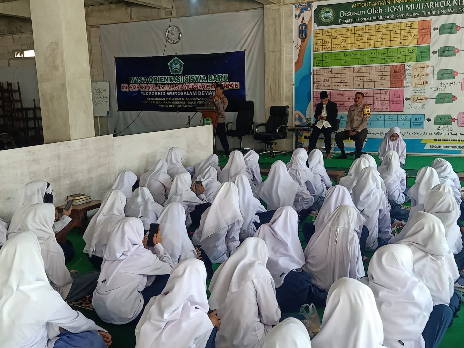 “Selamat datang bagi santri baru di pondok pesantren Al Mubarok Al Arbain yang berada di desa Tlogorejo, disini diharapkan menjadi tempat pendidikan bagi generasi muda untuk belajar nilai-nilai agama, pondok pesantren juga diharapkan menjadi tempat para santri untuk belajar nilai-nilai cinta Tanah Air. Hal itu disebabkan para santri merupakan generasi muda yang kelak akan menjadi pemimpin bangsa,” Kata Kapolsek Wonosalam.