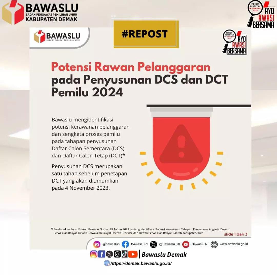 Dikutip dari laman resmi Instagram @bawasludemak, Selasa (29/08/23), penyusunan DCS merupakan satu tahap sebelum menetapkan DCT yang akan diumumkan pada 4 November 2023 .