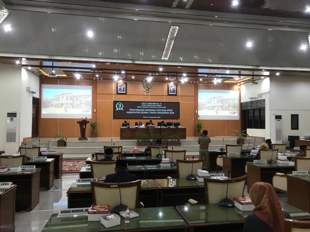 Demak – Ketua Dewan Perwakilan Rakyat Daerah (DPRD) Kabupaten Demak Fahrudin Bisri Selamet memimpin rapat paripurna ke-27 masa sidang III Tahun 2023 dengan acara penyerahan Rancangan Peraturan Daerah (Raperda) APBD Kabupaten Demak Tahun 2024, bertempat di ruang rapat paripurna DPRD Kabupaten Demak. Senin, (25/9/23).