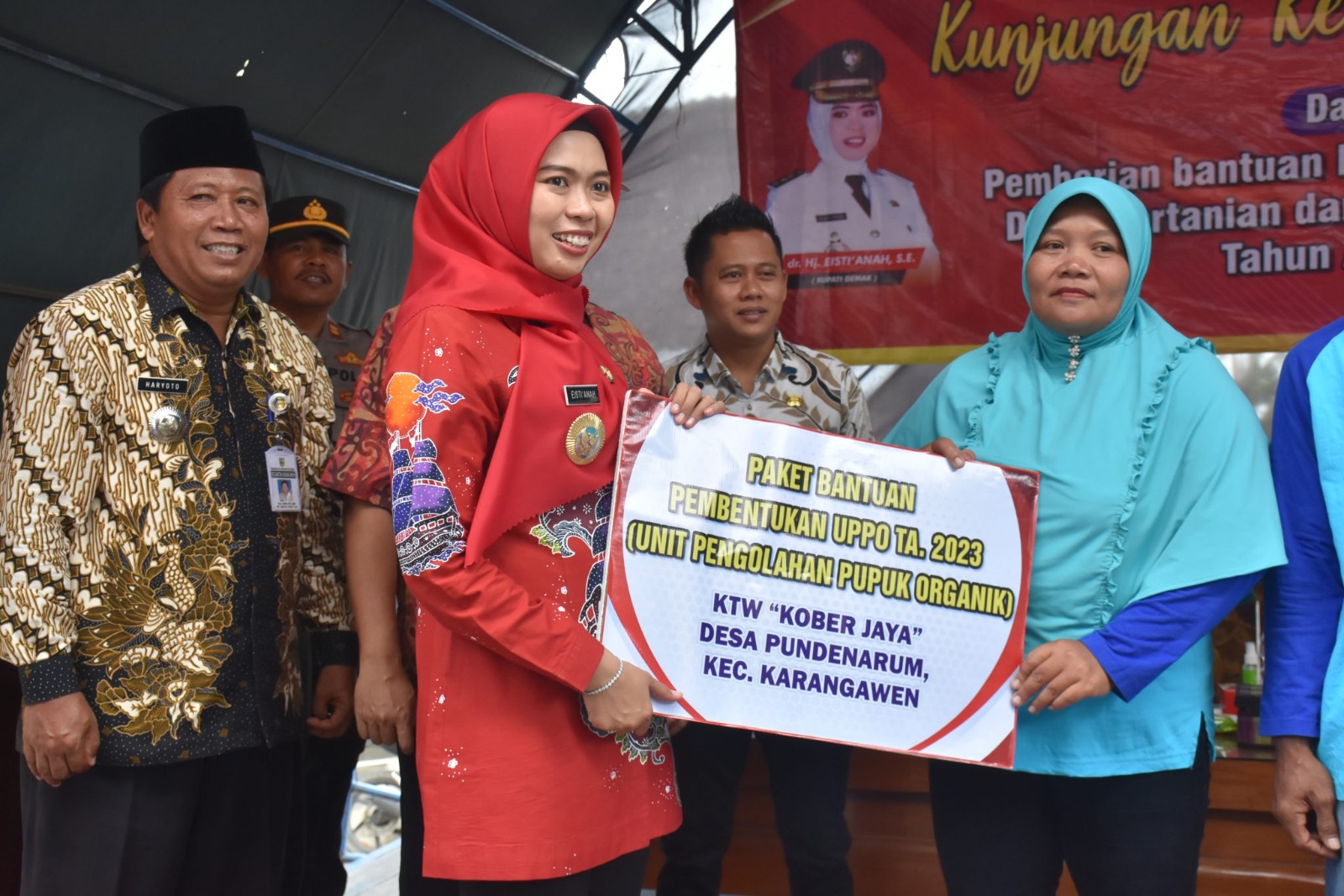 Demak – Bupati Demak Eisti’anah dalam kunjungan kerjanya di desa Rejosari kecamatan Karangawen menyerahkan bantuan untuk pembentukan Unit Pengolahan Pupuk Organik (UPPO). Yang berasal dari Dana Bagi Hasil Cukai Hasil Tembakau (DBHCHT) Dinas Pertanian dan Pangan Kabupaten Demak tahun anggaran 2023. Rabu, (25/10/23).
