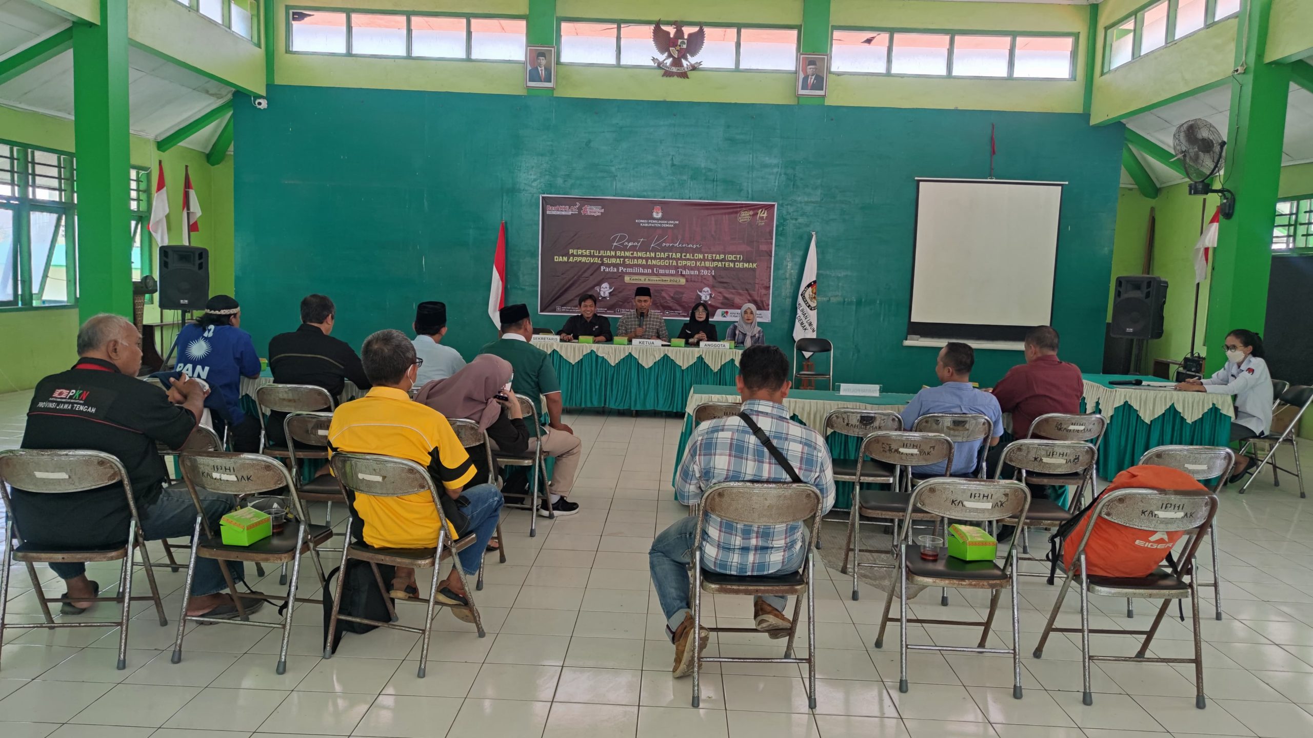 Demak – Komisi Pemilihan Umum (KPU) Demak gelar rapat koordinasi persetujuan rancangan daftar calon tetap (DCT) dan Approval surat suara anggota DPRD Kabupaten Demak pada pemilihan umum tahun 2024. Kamis, (2/11/2023).